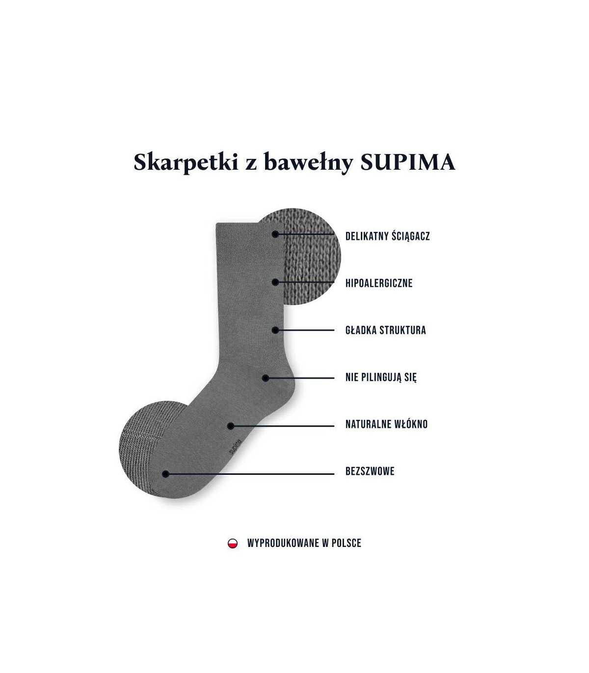 - artykuł 157 to skarpety dla mężczyzny z bawełny SUPIMA - supima jest certyfikowaną bawełną, uprawianą jedynie w południowo-zachodniej części Stanów Zjednoczonych - licencję do używania marki Supima posiada jedynie 300 wyselekcjonowanych fabryk, producentów i detalistów z całego świata - supima przewyższa pozostałe bawełny w swojej miękkości, wytrzymałości i nasyceniu kolorów, ponieważ hodowcy bawełny supima nie dopuszczają żadnych ustępstw względem jakości - dostępne rozmiarach od 41 do 46 skład: bawełna supima 71% poliamid 25% elastan 3% polipropylen 1%