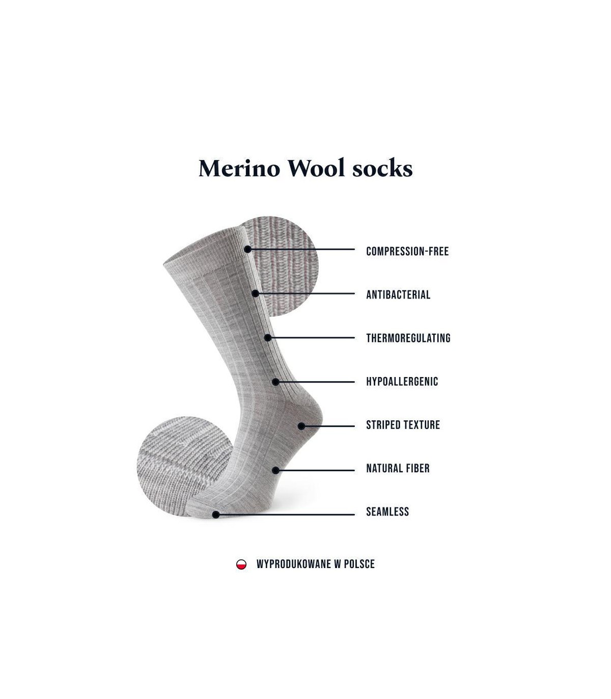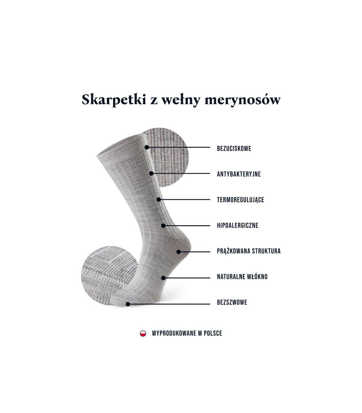 - artykuł 130 to skarpety w prążki dla mężczyzn wykonane z wełny merynosów - skarpetki posiadają dłuższą cholewkę - to produkt, który cechuje się wieloma właściwościami: utrzymuje nieprzyjemne dla bakterii środowisko, skutecznie odprowadza wilgoć, ma właściwości samoczyszczące - włókno wełny merino jest niezwykle cienkie i delikatne, a więc również przyjemne w dotyku - w zależności od pory roku skarpety grzeją lub chłodzą - komfort noszenia zapewnia bezszwowe łączenie oraz bezuciskowy ściągacz skład: wełna 79% poliamid 20% elastan 1%